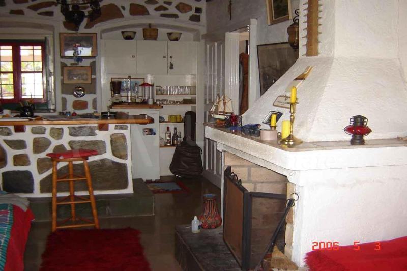 2-й уровень: гостиная с камином, спальня, кухня, ванная комната.
